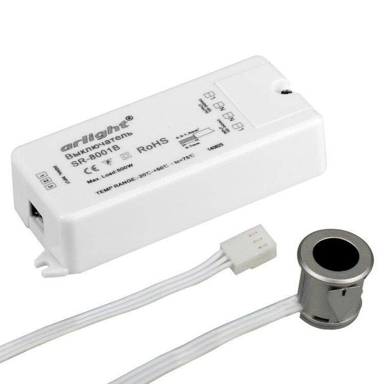 ИК-датчик SR-8001B Silver 220V 500W IR-Sensor от Arlight - бесконтактный выключатель для управления освещением на основе инфракрасного сигнала. Подходит для автоматического включения света при приближении объекта на расстоянии 1–6 см, например, при открывании дверцы шкафа или ящика. Максимальная нагрузка - 500 Вт, работает от сети 230 В.