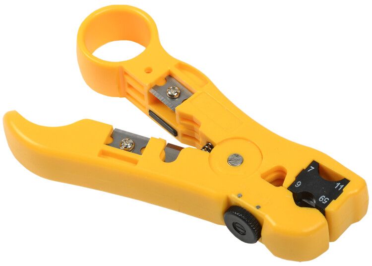 Инструмент для зачистки и обрезки коаксиального кабеля RG6/7/11/59 используется для подготовки кабелей перед обжимом разъёмов. Он позволяет одновременно снимать внешнюю изоляцию, оплетку и внутреннюю диэлектрическую оболочку, а также точно отрезать центральную жилу. Применяется при монтаже антенн, спутниковых приемников, IP-камер, TV-распределительных систем и других устройств, использующих коаксиальные соединения.