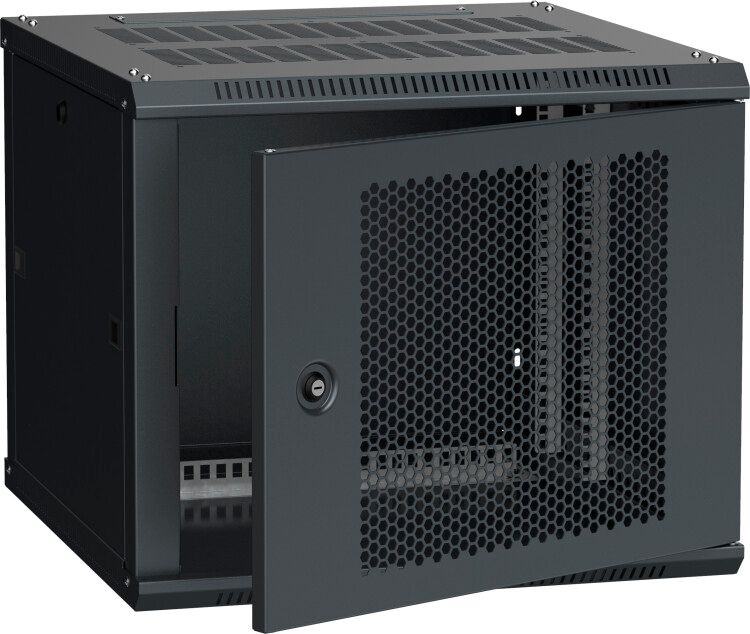 Шкаф 9U 600x600 мм с перфорированной дверью, цвет RAL9005 соответствует требованиям к настенным шкафам для IT-оборудования. Отсутствие степени защиты выше IP00 требует установки только во внутрипомещенческом варианте - в сухих, закрытых зонах без риска брызг, конденсата или пылевой среды. Серия LINEA W прошла проверку на механическую устойчивость и соответствие стандартным размерам 19” монтажа.
