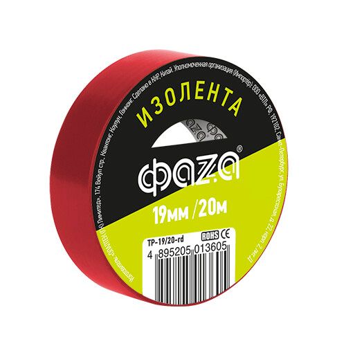 Изолента ПВХ 19 мм * 20 м красная от бренда ФАZA (артикул .5013605) - самоклеящаяся изоляционная лента из поливинилхлорида, предназначенная для надежной изоляции проводов и соединений в бытовых и промышленных электромонтажных работах.