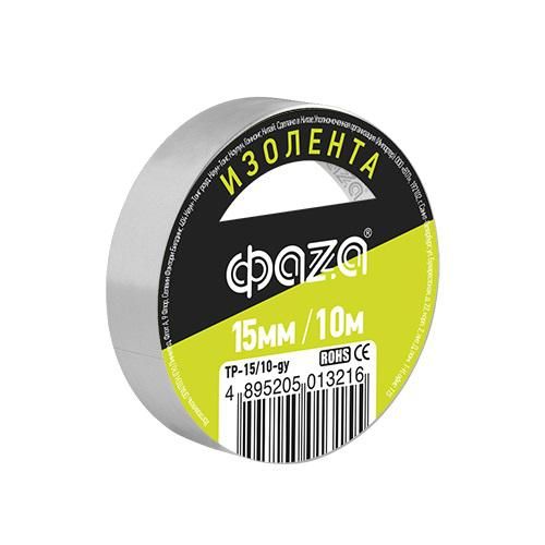 Изолента поливинилхлоридная ПВХ 15мм * 10м серая от бренда ФАZA (артикул 5013216) - самоклеящийся изоляционный материал для временной и постоянной защиты электрических соединений в условиях бытовых и промышленных нагрузок.