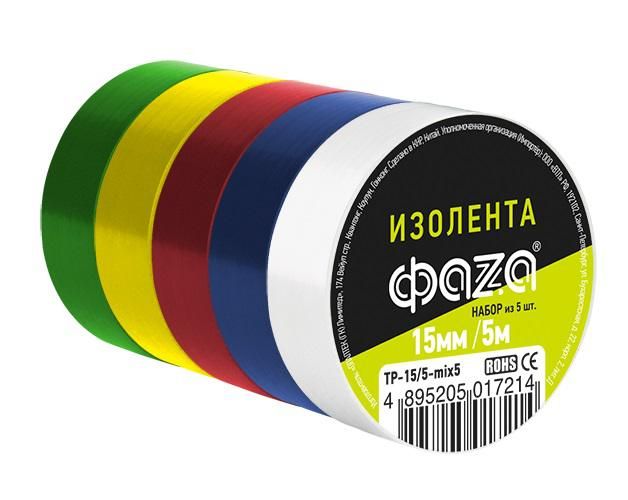 Изолента ПВХ 15ммх5м 5 цветов (уп.5шт) ФАZА 5017214 ФАЗА