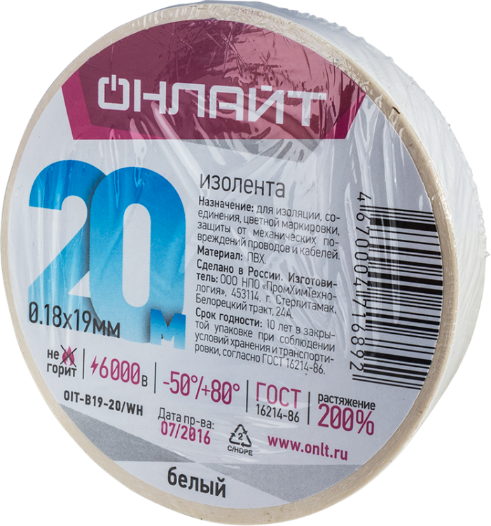 Изолента ПВХ белая 19 мм 20 м от бренда ОНЛАЙТ (артикул 19611) предназначена для надежной изоляции, соединения и защиты проводов и кабелей в условиях широкого диапазона температур. Эта изолента обеспечивает электрическую безопасность до 6000 В и устойчивость к механическим нагрузкам.