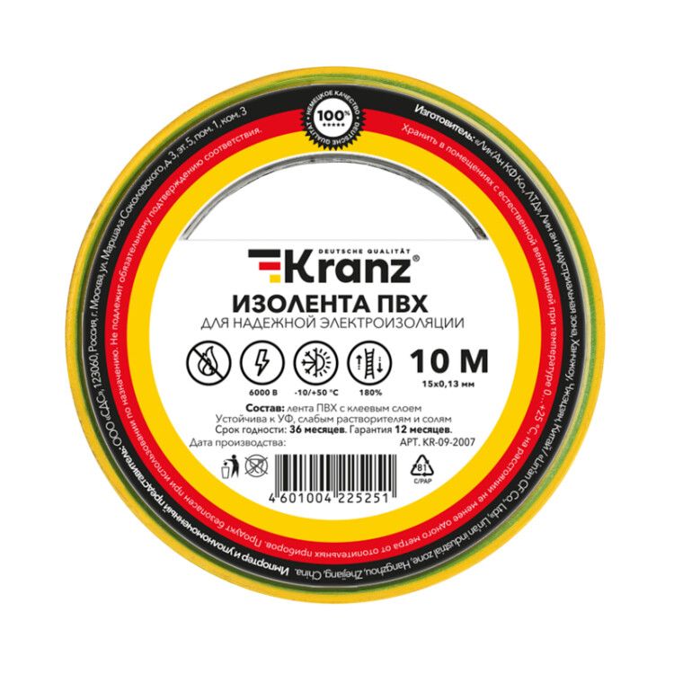 Изолента ПВХ 0.13х15 мм, 10 м, желто-зеленая (упаковка 10 штук) от бренда Kranz - это универсальное решение для изоляции и маркировки электропроводки на напряжения до 6000 В. Подходит для профессионального монтажа в условиях повышенной влажности, перепадов температур и воздействия солнца.