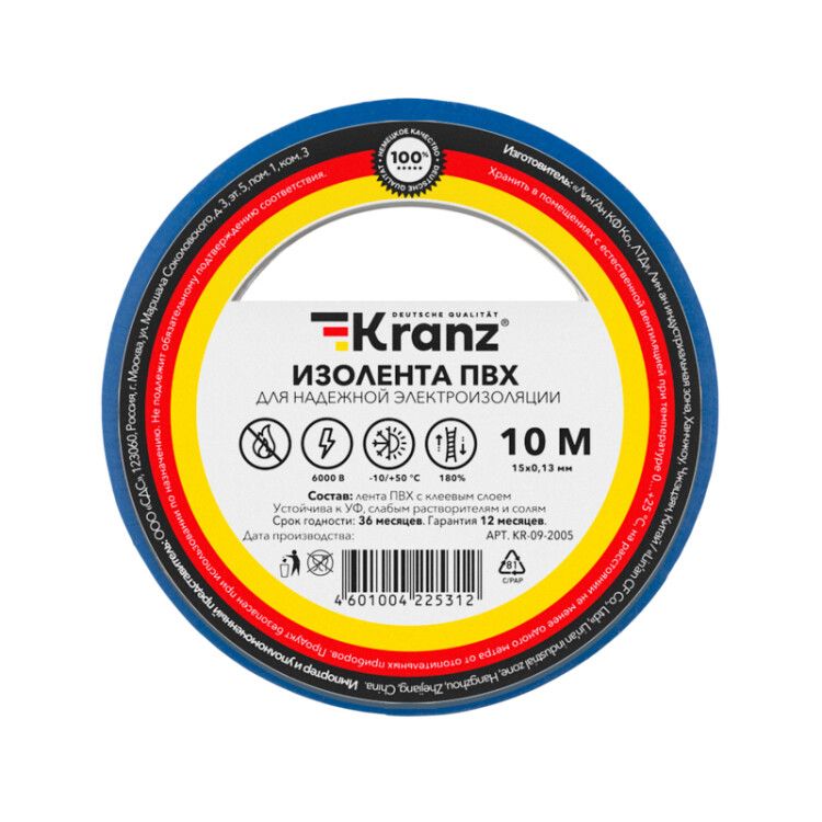 - Изолента ПВХ 0.13х15 мм, 10 м, синяя (упаковка 10 штук) от Kranz хорошо сочетается с другими продуктами серии - можно комплектовать наборы по цветам.