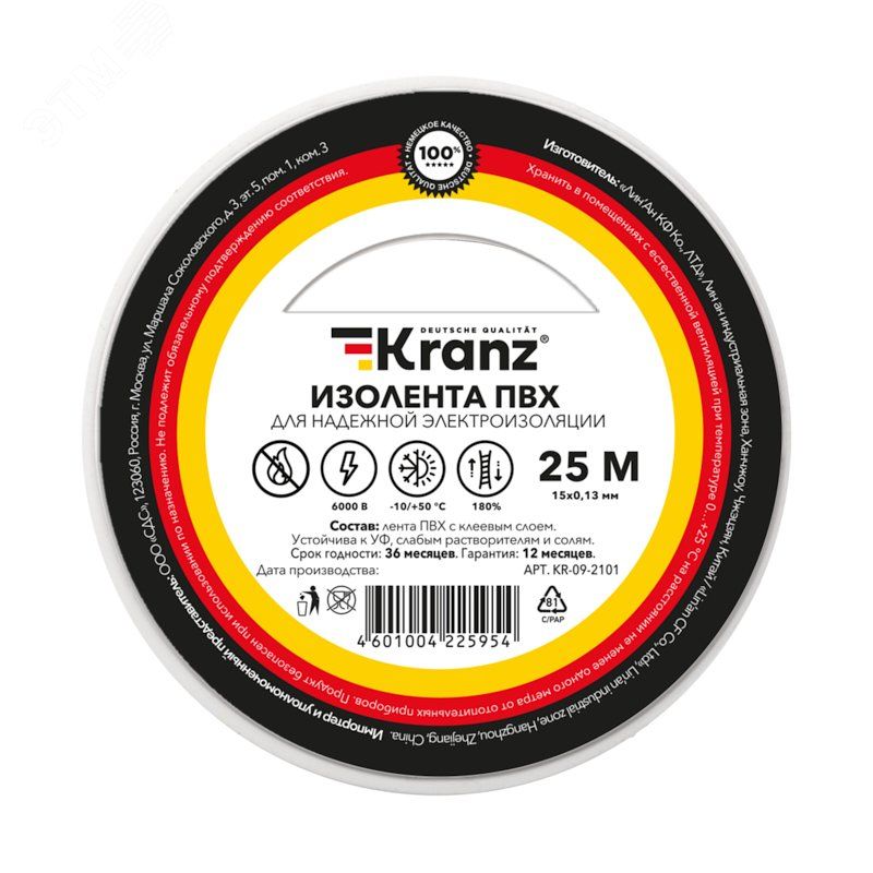 | Изолента ПВХ KRANZ 0.13х15 мм, 25 м, белая - KR-09-2101 | 24.02.2026 | Под заказ | 64,75 ₽ | рул. | от 30 дней |