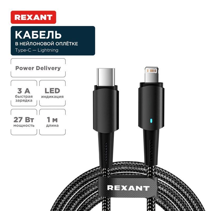 Кабель Type-C – Lightning для Apple, 3А, 1м, в черной нейлоновой оплетке, со световой индикацией | 18-7069 REXANT MEET