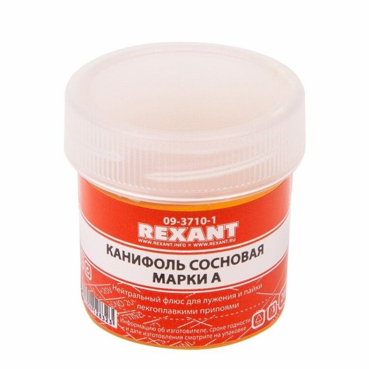 Канифоль сосновая марки А REXANT (артикул 09-3710-1) - это нейтральный флюс на основе натуральных хвойных смол, предназначенный для подготовки медных поверхностей к пайке и улучшения качества соединений на печатных платах и радиокомпонентах.