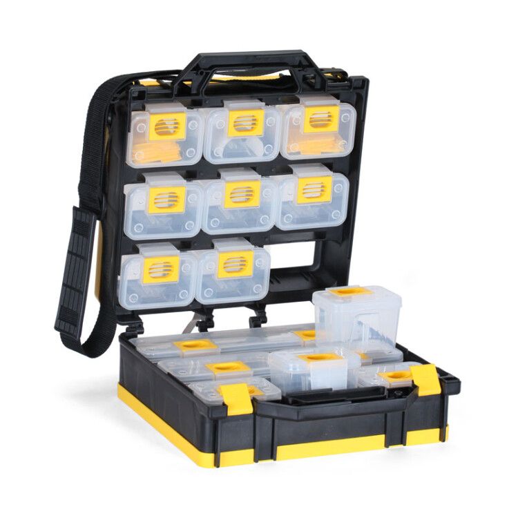 Кейс-органайзер К-01 серия ПРОФИ не требует установки. Все внутренние модули легко вставляются в корпус и фиксируются клипсами - без инструментов. Модули можно свободно вынимать, перемещать между собой или использовать вне корпуса. Плечевой ремень крепится к корпусу через металлические кольца и обеспечивает комфортную переноску даже при полной нагрузке. Защёлки открываются одним движением, не требуют усилий.