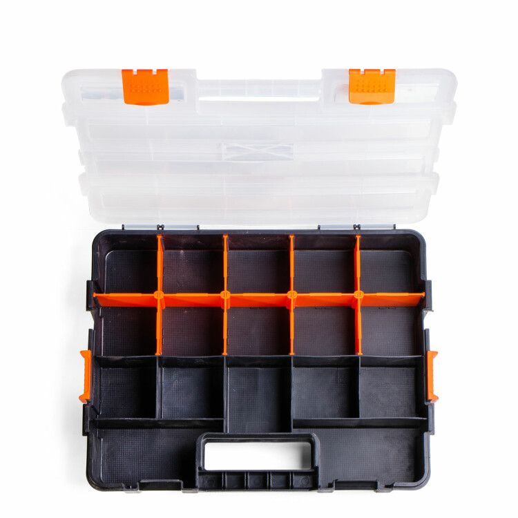 - Кейс оснащен прозрачной крышкой, которая позволяет легко идентифицировать содержимое органайзера без необходимости его открывать.