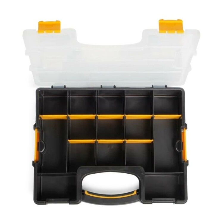 Кейс-органайзер К-03 серия ПРОФИ предназначен для хранения и перевозки мелких предметов: болтов, гаек, свёрл, отверток, предохранителей, проводов и других мелких элементов. Подходит для электромонтеров, слесарей, автосервисов, радиолюбителей и производственных участков, где важна быстрая доступность инструментов и порядок на рабочем месте.