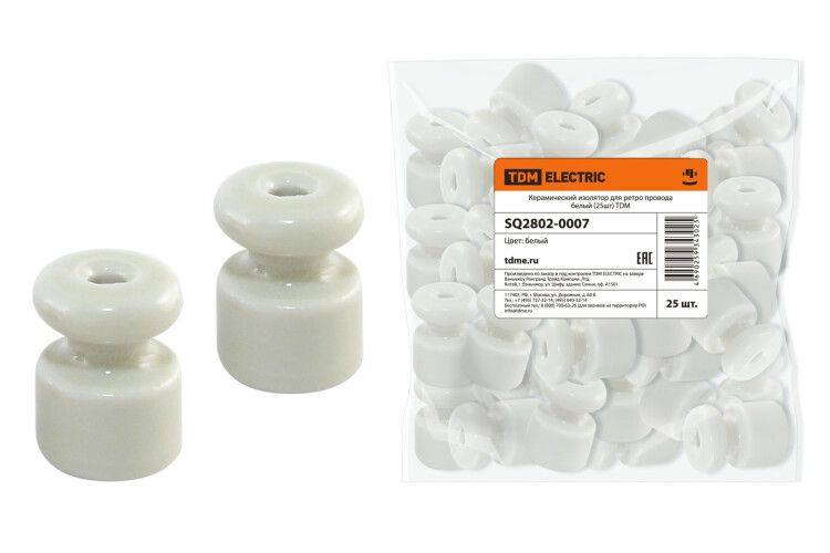 Керамический изолятор для ретро провода белый (25 штук) от TDM ELECTRIC - элемент крепления для наружной прокладки ретро-проводов в деревянных зданиях, интерьерах в стиле ретро и исторических объектах. Каждый изолятор выдерживает два провода, обеспечивая безопасную фиксацию без повреждения изоляции.