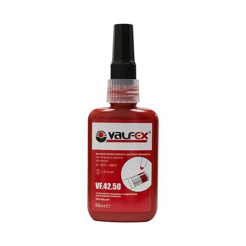 Клей-герметик анаэробный тюбик 50 мл демонтаж с нагревом 120/10 красный от VALFEX (артикул vf.42.50) предназначен для надёжного крепления и герметизации резьбовых соединений, которые требуют периодического демонтажа с применением тепла до 120 C.