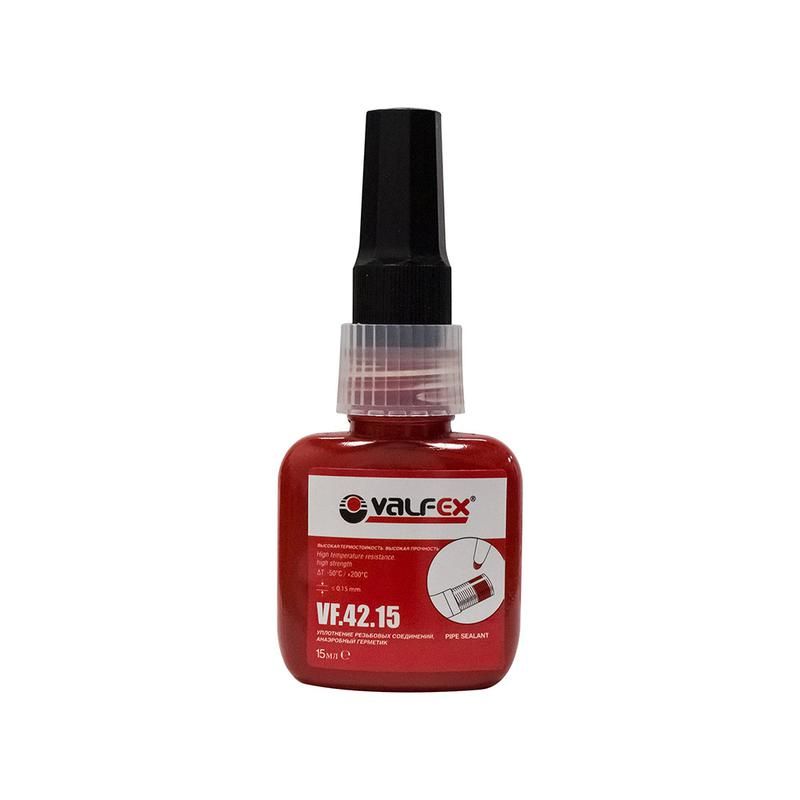 Клей-герметик анаэробный тюбик 15 мл демонтаж с нагревом от бренда VALFEX (артикул vf.42.15) предназначен для надёжного герметизирования и фиксации резьбовых соединений в металлических деталях, где требуется последующий демонтаж с применением тепла.