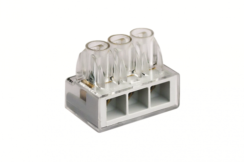 Клеммная колодка соединительная 3х7,5мм монтируется исключительно **на кабель** - то есть закрепляется непосредственно на жиле, а не на DIN-рейку. Для установки на рейку необходимо использовать дополнительный суппорт 159SM. Отдельно стоит отметить: хотя в описании производителя упоминаются винты, сама модель использует **пружинный зажим**, что делает монтаж проще и безопаснее - не нужен отвёртка, риск перетянуть или повредить контакт минимален. Провод вставляется в гнездо до характерного щелчка; для освобождения достаточно нажать на рычаг зажима.