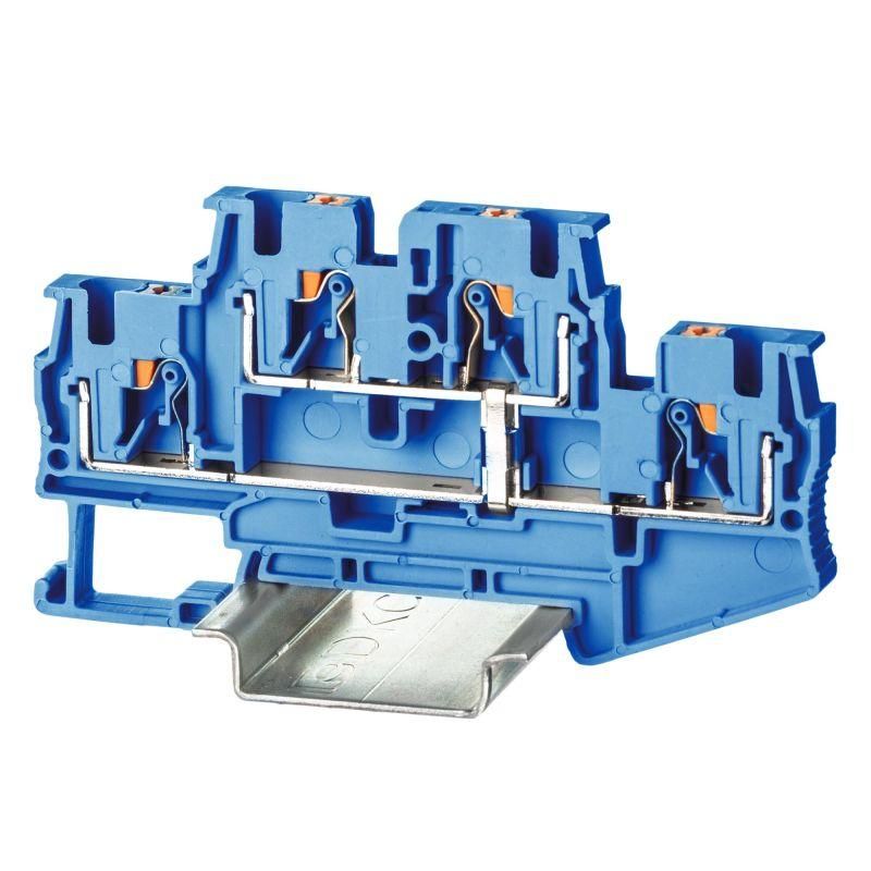 Клемма двухуровневая, зажим push-in, 4 точки подключения, с перемычкой между уровнями, 4 кв.мм, синяя от бренда DKC (ДКС), артикул vprtt-4-pv-bu - надёжное решение для быстрого и безопасного соединения проводов на DIN-рейке. Подходит для автоматизации, распределительных щитов и промышленного оборудования.
