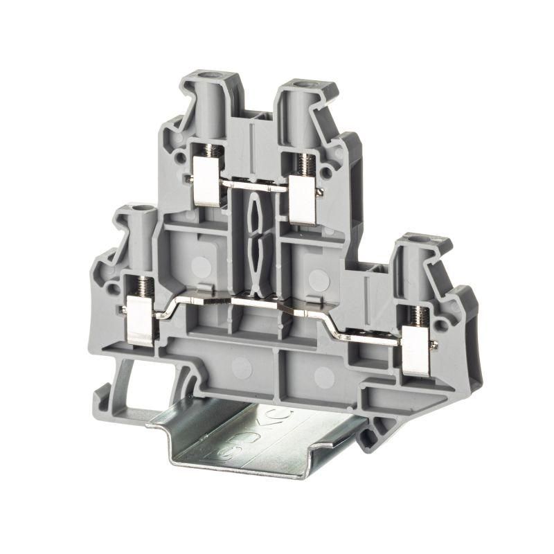 Клемма двухуровневая, винтовой зажим, 4 точки подключения, 4 кв.мм, серая совместима со всеми стандартными DIN-рейками 35 мм. Для соединения точек внутри одного уровня или между уровнями требуются вставные перемычки - они не входят в комплект и должны быть выбраны отдельно. Установка выполняется просто: защёлкивается на рейку, затем затягиваются винты. Каждый уровень имеет два отверстия для подключения - можно подсоединить два провода на одном уровне. Перемычки обеспечивают гибкую коммуникацию между контактами.