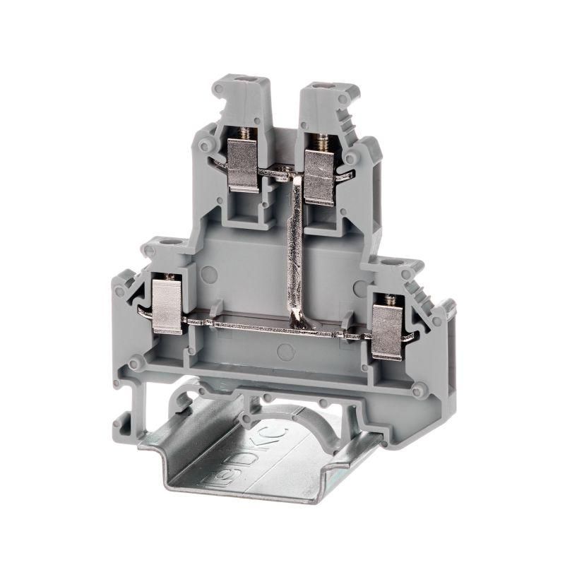 Клемма двухуровневая, винтовой зажим, 4 точки подключения, 2.5 кв.мм, серая, с перемычкой от DKC (ДКС), артикул kruk-3-pv - компактное решение для надёжного соединения нескольких проводов в распределительной коробке или на DIN-рейке, где важна плотная упаковка и высокая надёжность контакта.