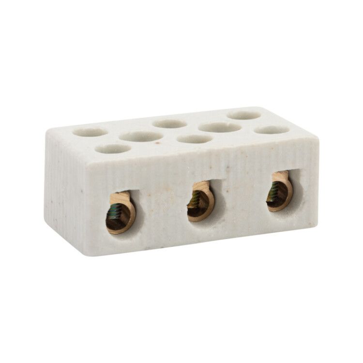 Клемма керамическая винтовая 16 мм2 3 пары контактов с крепежным отверстием (45 шт./уп.) монтируется на поверхность с помощью болта или винта через одно центральное отверстие. Установка возможна на металлические, керамические или огнеупорные основания. Соединение проводов осуществляется путём ослабления винта, введения жилы и затяжки до упора - рекомендуется использовать отвёртку с плоским лезвием подходящего размера. Для многожильных проводов желательно применять наконечники типа НШВИ, чтобы предотвратить распушивание жил при затяжке. Позиция входа - боковая, что позволяет организовать компактную трассировку проводов в ограниченном пространстве.