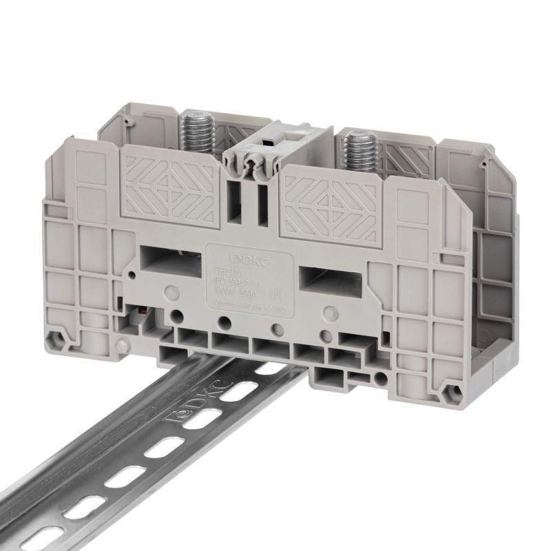 Клемма проходная, болтовой зажим, 2 точки подключения, 120 кв.мм, серая от DKC (ДКС) - надёжное решение для передачи тока между двумя проводниками в распределительных щитах. Артикул fer-120 обеспечивает устойчивое соединение при высоких нагрузках и монтируется на стандартную DIN-рейку.