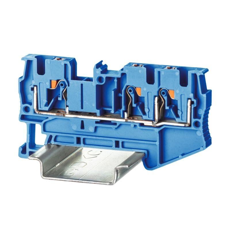 Клемма проходная, зажим push-in, 3 точки подключения, 4 кв.мм, синяя от DKC (ДКС) - надёжное решение для быстрого и безопасного соединения трёх проводников на DIN-рейке. Артикул vpr-4-twin-bu подходит для промышленной автоматизации, распределительных щитов и систем управления.