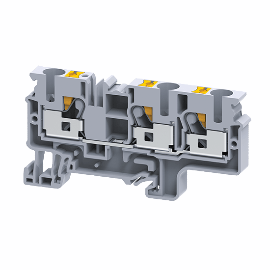 Клемма с 3-мя контактами push-in 10 кв.мм OptiClip CP-10-TRIPLET-I-BU синий устанавливается на стандартную DIN-рейку шириной 35 мм. Для подключения провода достаточно зачистить жилу на 9–10 мм, вставить её в гнездо до упора - зажим сработает автоматически. Отключение выполняется нажатием на специальную кнопку: она высвобождает пружину, и провод легко извлекается. Монтаж возможен в любом положении - клемма не требует ориентации “вверх” или “вниз”. Учитывайте, что ширина устройства составляет 0 мм - это значит, что клеммы можно устанавливать вплотную друг к другу без зазора, экономя место в щите.