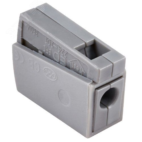 Клемма ed 224-101 монтируется встык: провод вставляется в гнездо до щелчка, после чего он зажимается автоматически. Нельзя переставлять провод после фиксации - при попытке извлечь его без открытия рычага возможна деформация контакта. Для демонтажа необходимо поднять рычаг, затем вытянуть провод. Устройство не требует отверток, шнуров или болтов. Совместимо только с медными проводами - алюминиевые и многожильные с опрессовкой не рекомендуются.