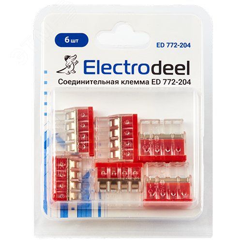 Клемма соединительная 4-контактная (6шт) Elеctrodeel. Диапазон сечений 0,5-2,5 мм2. Номинальный ток/напряжение: 24А/450В. Упаковка: блистер. - ED 772-204-b6 ELECTRODEEL