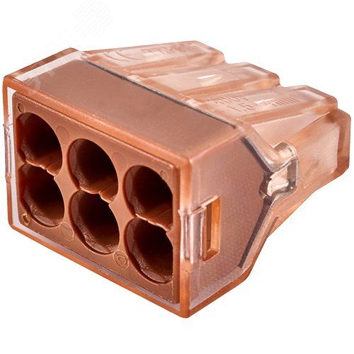 Дополнительная информация о клемме указывает на прозрачный корпус с коричневой приемной частью. Это позволяет визуально контролировать подключение проводников и обеспечивает простоту в использовании.
