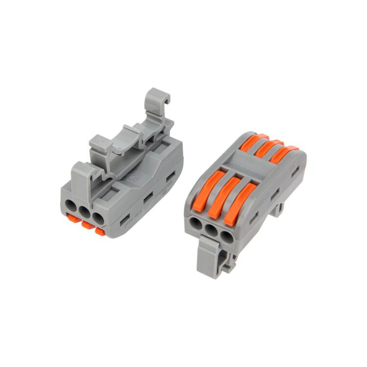 Клемма СМК 222-423D проходная крепится на стандартную DIN-рейку шириной 35 мм. Установка занимает несколько секунд: просто защёлкните её в рейку до характерного щелчка. Для подключения используйте рычаг управления - он открывает зажим, позволяя вставить провод. После вставки рычаг возвращается в исходное положение, плотно фиксируя жилу. Отсоединение также происходит через рычаг - не требуется инструмент. Проверить наличие напряжения можно через технологическое отверстие на корпусе - достаточно ввести щуп мультиметра, не вскрывая клемму.