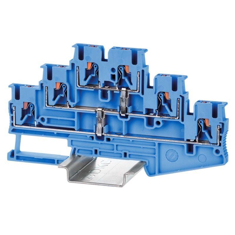 Клемма трехуровневая зажим push-in 6 точек подключения с перемычкой между уровнями 2.5 кв.мм синяя от DKC (ДКС) - компактное решение для быстрого и надежного соединения нескольких проводников на DIN-рейке. Артикул vpr-2.5-3l-pv-bu обеспечивает шесть точек подключения с внутренней перемычкой между уровнями, что упрощает распределение фазы или нуля в распределительных щитах.