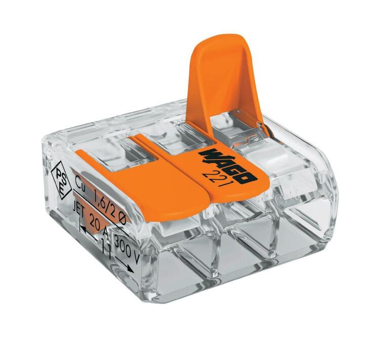 Клемма WAGO 221-613 имеет компактную форму - на 40% меньше, чем аналогичные модели серии 222. Это важно при ограниченном пространстве в щитах. На задней стенке есть специальное отверстие для тестирования: можно проверить наличие напряжения или целостность цепи штыревым щупом мультиметра, не открывая корпус. Конструкция исключает перегрев - благодаря равномерному распределению давления на провод и качественной меди.