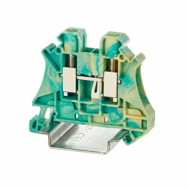Клемма заземления винтовой зажим 2 точки подключения 6 кв.мм легко фиксируется на стандартной DIN-рейке 35 мм. Для правильной установки необходимо использовать торцевую пластину - она обеспечивает изоляцию соседних клемм и защищает от случайного прикосновения. Монтаж выполняется вручную: клемму просто защелкивают на рейке, затем ослабляют винты, вставляют провода и затягивают до упора. Не требует специальных инструментов, кроме отвертки.
