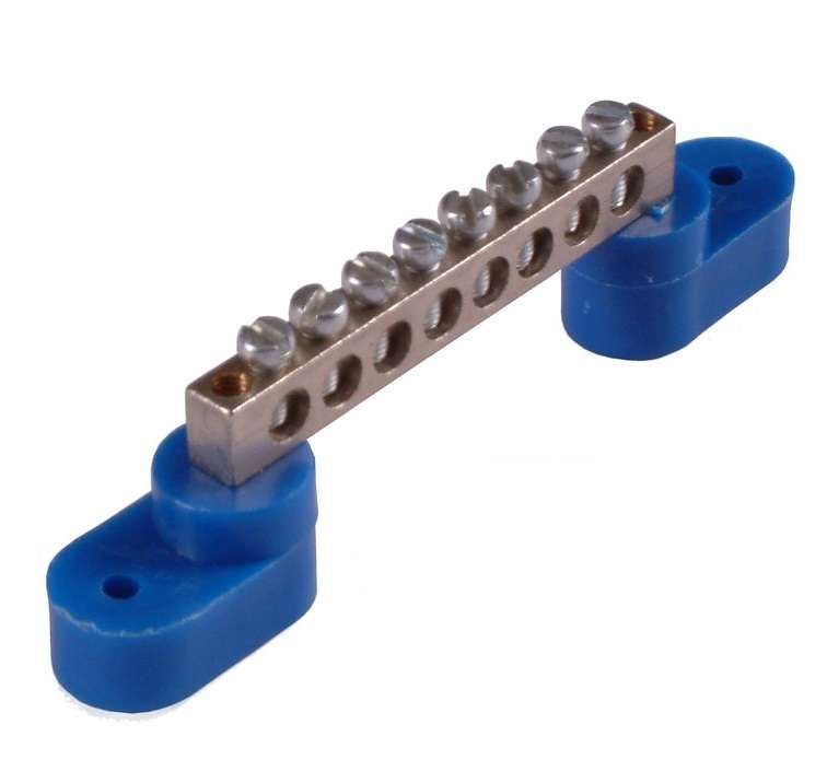 Шина нулевая на 7 присоединений 63А на 2 изоляторах стойка не устанавливается на DIN-рейку. Её крепят болтами или саморезами через отверстия в изоляторах к металлической или неметаллической поверхности. Подходящий момент затяжки - средний, чтобы не повредить резьбу в латуни. Диаметр отверстий под изоляторы рассчитан под стандартные крепёжные элементы M4–M5. Провода сечением до 16 мм2 легко помещаются в зажимы. Перед монтажом проверьте, что все провода имеют одинаковый тип изоляции и подходят по габаритам к клеммам.