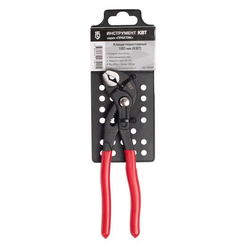 Клещи переставные 180 мм от бренда КВТ (артикул 85282) - надёжный инструмент для точного захвата и удержания деталей различной формы в условиях монтажа, сантехники и слесарных работ. Благодаря сквозному шарниру и пластизольным рукояткам с изоляцией они подходят как для обычных, так и для электромонтажных задач.