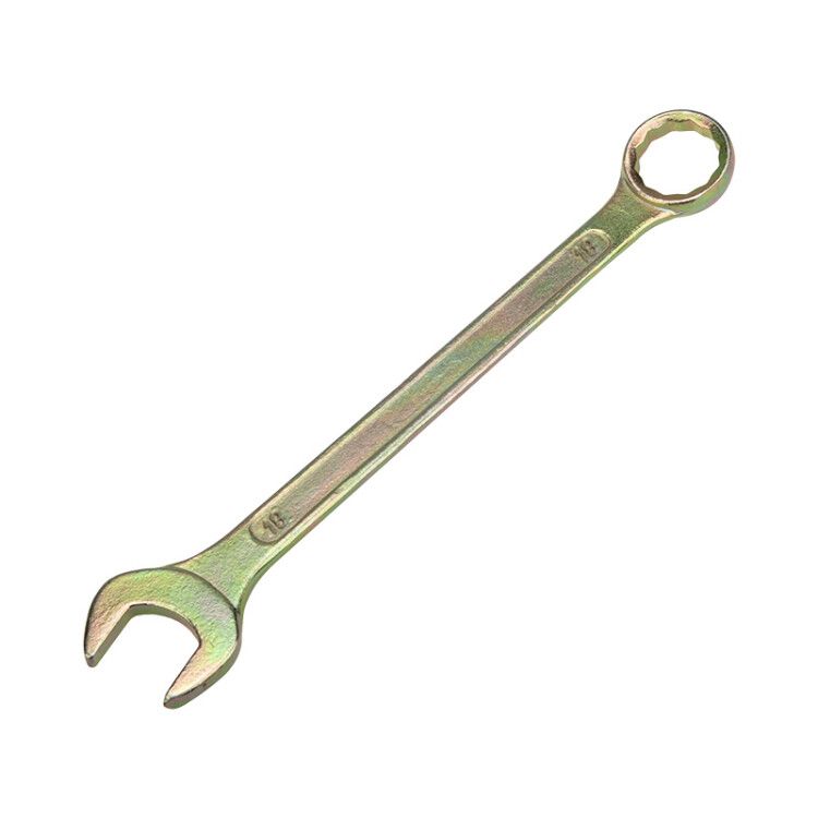 Ключ комбинированный 18 мм, желтый цинк предназначен для работы с резьбовыми соединениями: гайками, болтами, шпильками и муфтами. Одна сторона имеет рожковую головку - удобна для плотного захвата, вторая - накидную - позволяет работать в ограниченном пространстве. Инструмент применяется в автосервисах, машиностроении, ЖКХ, строительстве и домашних ремонтных задачах.