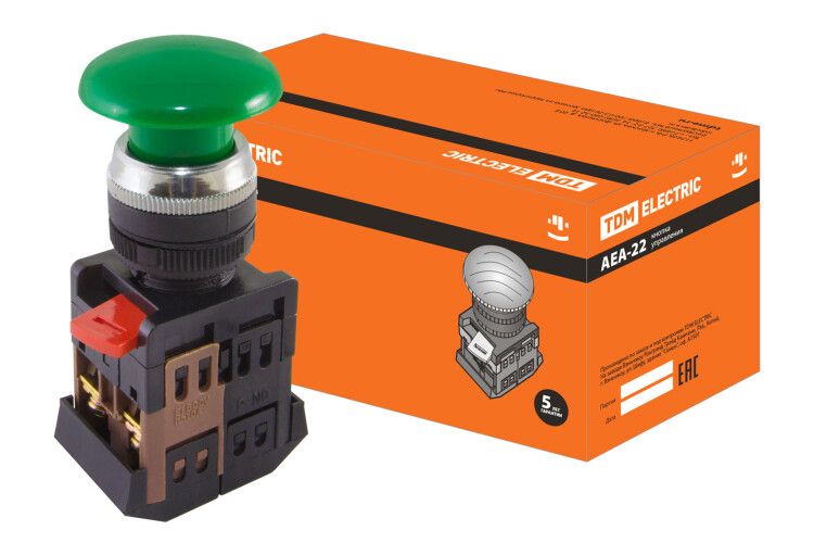 Кнопка AEА-22 "Грибок" зеленый d22мм 1з+1р от TDM ELECTRIC - это светосигнальный индикатор, предназначенный для индикации состояния электрических цепей и оперативного управления контакторами и реле автоматики в электрических цепях переменного и постоянного тока.