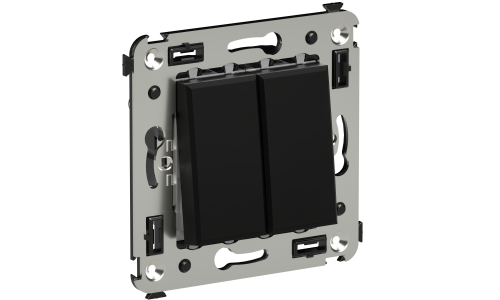 Кнопка двухклавишная в стену, черный матовый устанавливается в подрозеточные коробки глубиной не менее 45 мм. Для фиксации используется встроенный каркас с лапками - не требует саморезов, если коробка имеет подходящую форму. Кабель вводится через два отверстия диаметром 3 мм на каждую клемму. Защита провода осуществляется с помощью шаблона для зачистки длиной 11 мм. Соединение выполняется винтовыми зажимами - допускаются медные одножильные провода сечением до 2,5 мм2. Монтаж возможен только после отключения электроэнергии.