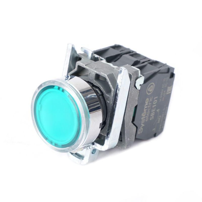 Кнопка модульная SB4 с подсветкой в сборе 22мм металл 24ВDC 1НО+1НЗ зел. SE SB4BW33B5 APC
