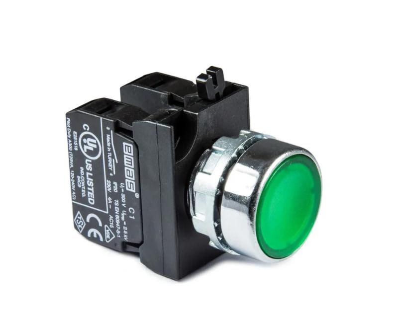 Кнопка используется для включения, выключения и индикации работы оборудования через замыкание или размыкание электрических цепей. Подходит для управления питанием, сигналами тревоги и командными цепями в промышленных щитах, станках, конвейерах, системах автоматизации и объектах энергоснабжения. Зелёный цвет подсветки указывает на активное состояние - например, «пуск» или «работает».