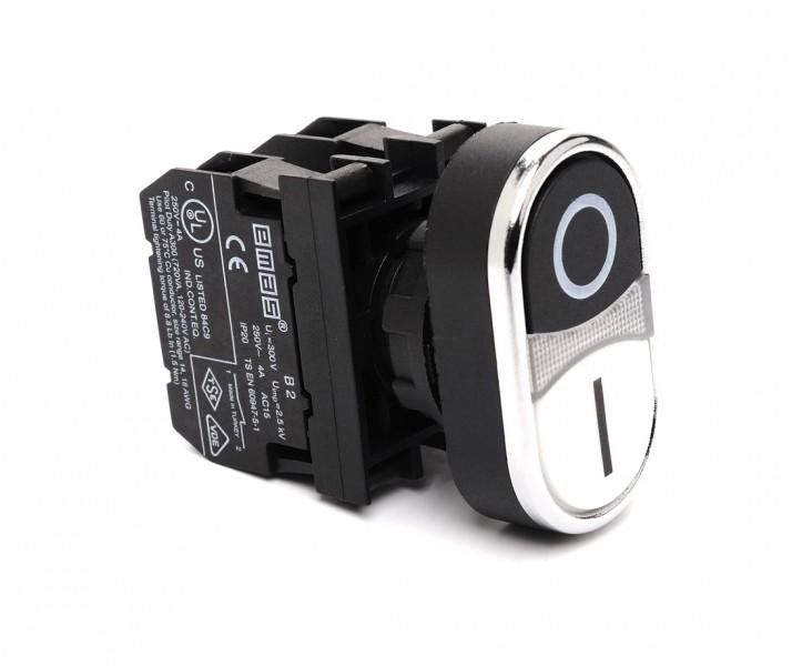 Кнопка нажимная сдвоенная черная/белая EMAS b102k20hb - устройство управления с двумя независимыми контактами (1 нормально открытый и 1 нормально закрытый), предназначенное для коммутации цепей управления в автоматизированных системах. Без фиксации, без подсветки, с маркировкой I-0 и прочным корпусом из огнестойкого материала.
