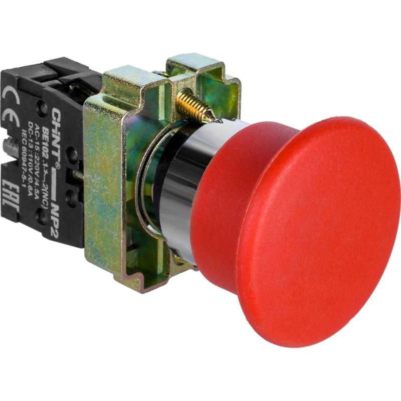 Кнопка управления "Грибок" диаметром 22 мм, серия NP2-BC42, бренд CHINT - это надёжный элемент управления с самовозвратом и одним нормально-замкнутым контактом, предназначенный для аварийной остановки оборудования. Красный цвет и круглая форма обеспечивают быстрое распознавание в условиях производства.
