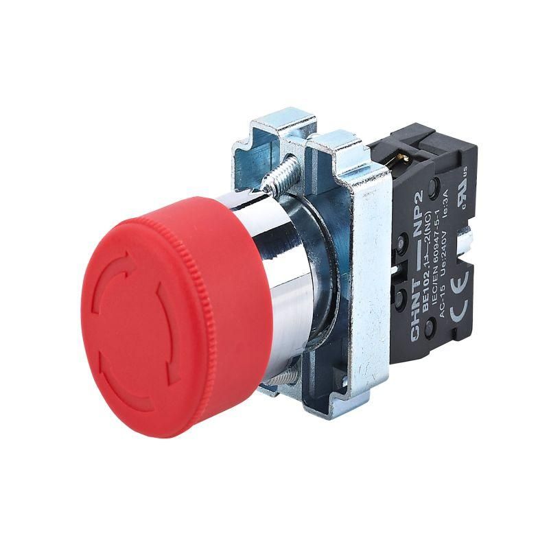 Кнопка управления "Грибок" диаметром 40 мм с фиксацией, серия NP2-BS542 от бренда CHINT - это надёжный элемент управления для аварийной остановки оборудования. Устройство предназначено для ручного отключения цепей в экстренных ситуациях, особенно там, где требуется визуальная заметность и механическая фиксация положения.