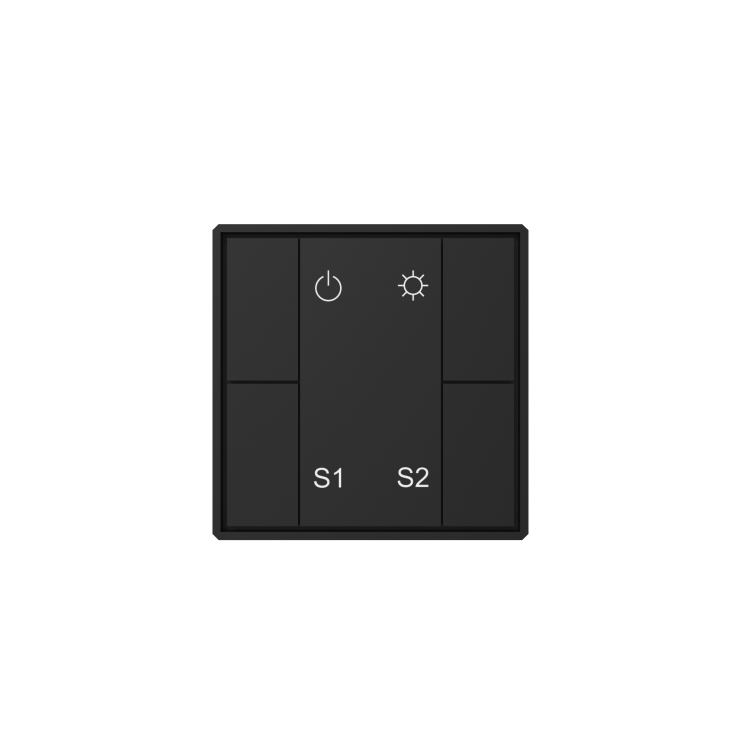 Панель кнопочная 4-х клавиш (1 группа/2 сцены), пластиковый корпус, черный используется для управления освещением в помещениях с применением системы DALI. Подходит для контроля одной группы светодиодных светильников - например, в офисах, гостиницах, торговых залах или жилых интерьерах. Кнопки позволяют включать/выключать свет и изменять уровень яркости (диммирование), а выбор группы задаётся механически через поворотный переключатель на тыльной стороне устройства.