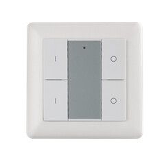 Панель кнопочная 4-х клавиш (2 группы) - накладного типа, монтируется на стену без необходимости углубления. Для установки достаточно подключить её к шине DALI. Переключение между группами происходит вручную с помощью поворотного переключателя на задней панели - он выбирает, какая группа (1 или 2) будет реагировать на нажатия кнопок.