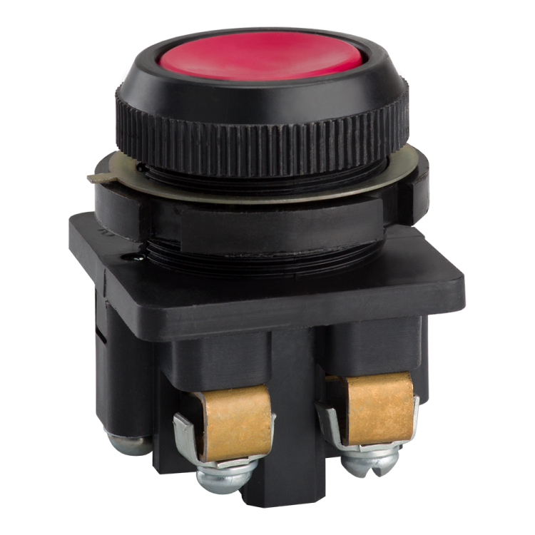 Выключатель кнопочный КЕ 011 У3 исполнение 2 красный от КЭАЗ - это надёжный элемент управления для цепей сигнализации и автоматики, рассчитанный на работу с переменным и постоянным током до 660 В и током до 10 А. Подходит для монтажа на панели оборудования с диаметром отверстия 30,5 мм.