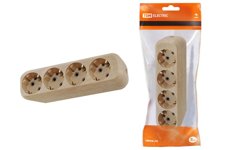 Колодка розеточная 4 гнезда 2П+3 16 А 250 В (сосна) от TDM ELECTRIC - это надёжный распределительный блок с четырьмя заземлёнными розетками, предназначенный для внутреннего монтажа в жилых и офисных помещениях. Материал корпуса - термопласт без галогенов, цвет имитирует натуральное дерево, что делает её подходящей для интерьеров в классическом стиле.