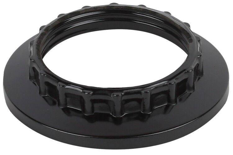 Кольцо совместимо со всеми стандартными патронами E27, имеющими внешнюю резьбу. Устанавливается путем накручивания на резьбу патрона перед его вставкой в корпус светильника. После этого кольцо зажимается между патроном и стенкой корпуса, обеспечивая жесткую фиксацию. Для правильной сборки проверьте внутренний диаметр резьбы патрона - он должен соответствовать наружному диаметру кольца. Не используйте с патронами, где резьба имеет другую форму (например, M10x1 или M12x1).