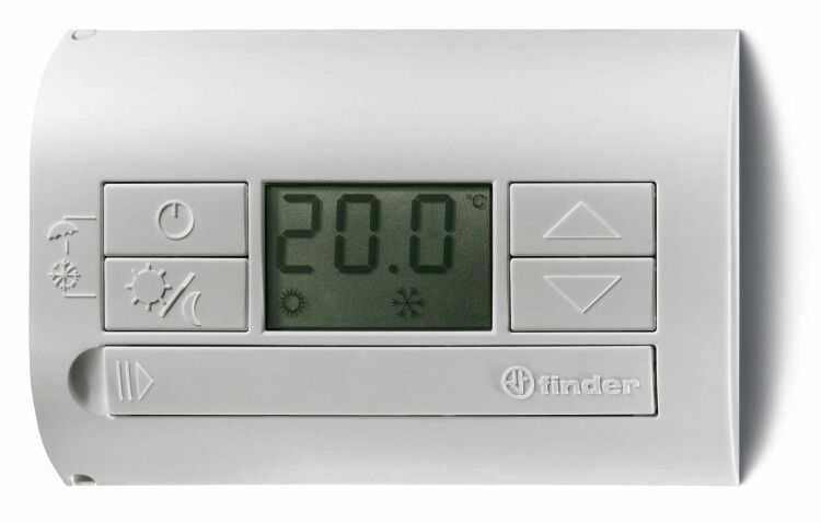 Термостат комнатный 3В DC 1СО 5А монтаж на стену кнопки ВКЛ/ВЫКЛ ЛЕТО/ЗИМА дисплей бел. FINDER 1T3190030000 1T.31.9.003.0000
