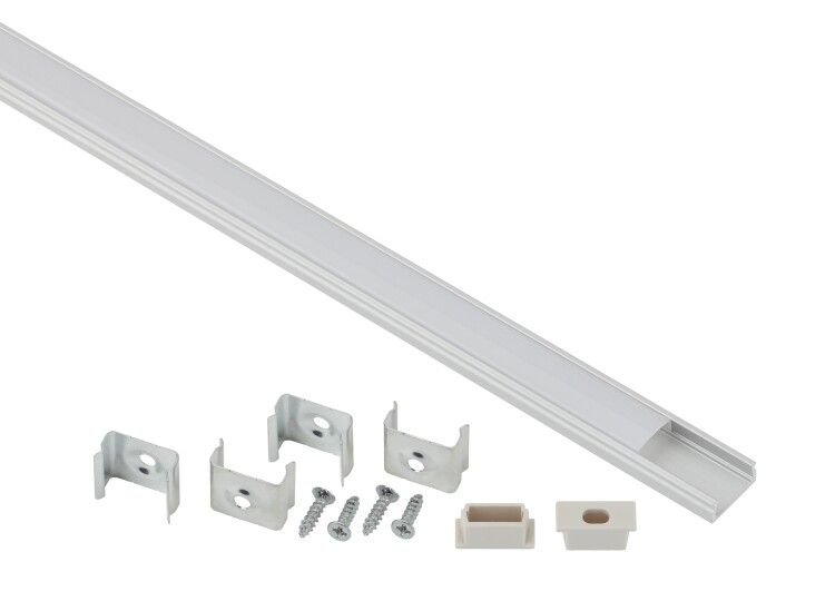 Комплект с накладным анодированным профилем CAB262 16×6 мм, 2 м предназначен для фиксации светодиодных лент шириной до 10 мм на поверхностях стен, потолков, шкафов и других конструкциях. Он служит одновременно теплоотводящим радиатором, защитным кожухом и рассеивающим элементом. Подходит для внутреннего освещения: подсветки мебели, ниш, декоративных зон, торгового оборудования и офисных помещений.